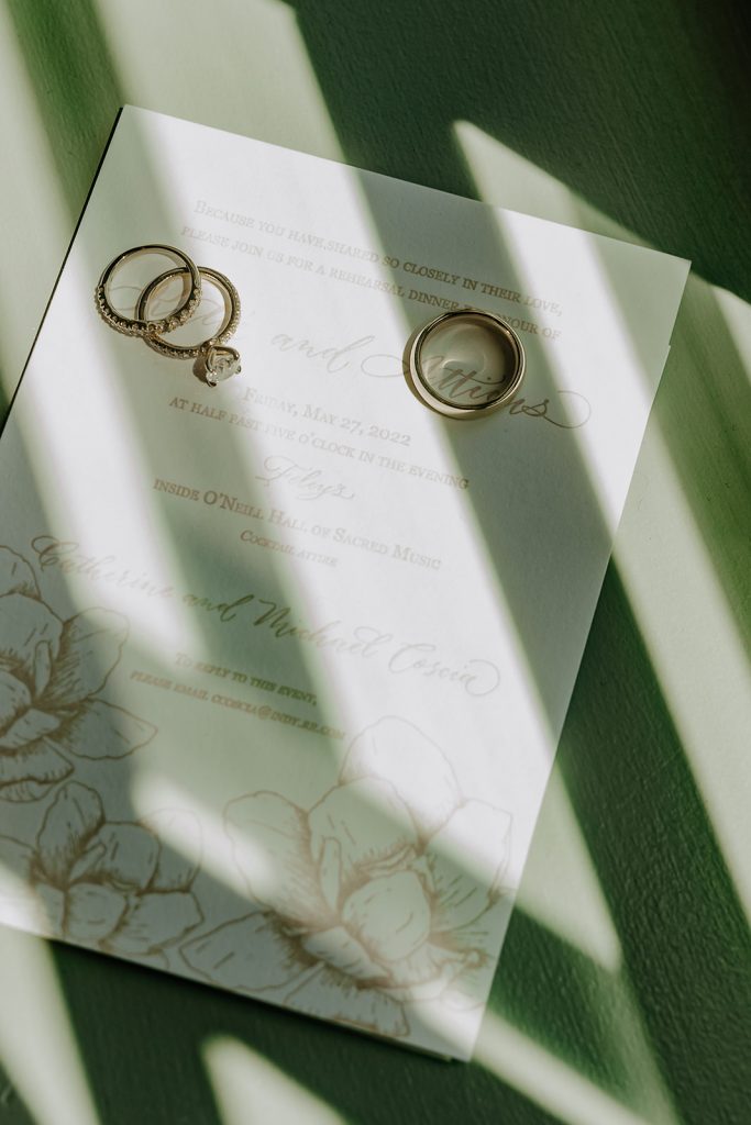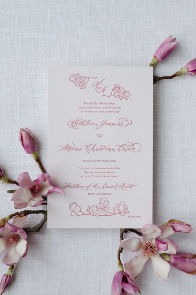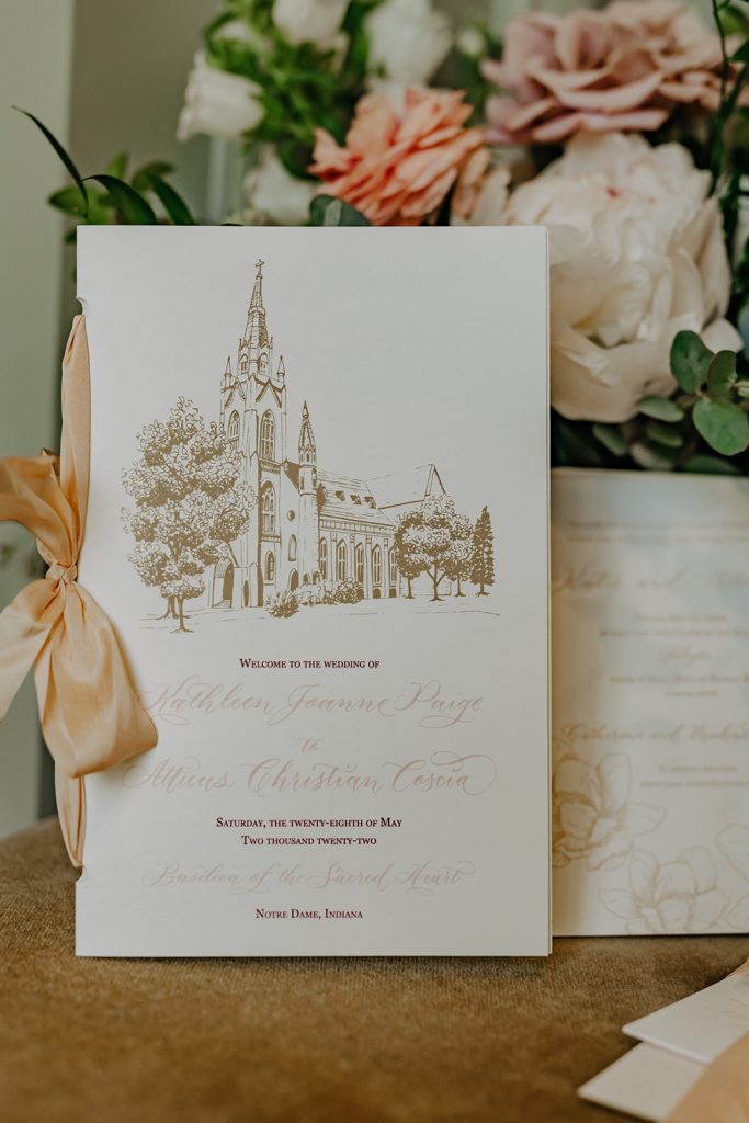 For their wedding at Notre Dame, this sweet couple wanted to highlight the place that was so meaningful to them in their custom invitations. The map of their special campus experience highlighted their love story, including a custom hand-drawn illustration of the Basilica of the Sacred Heart, the actual (incredible) setting where they’d say “I do.”