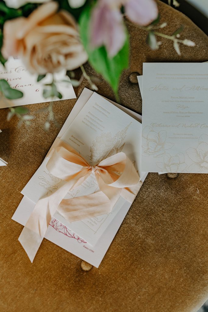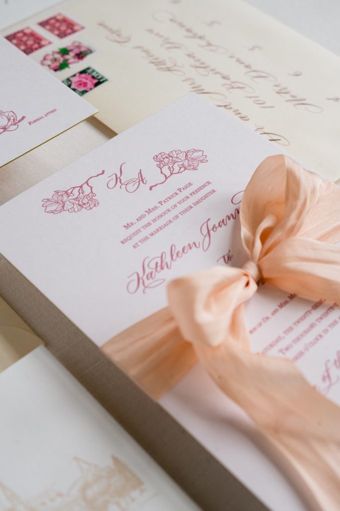 Their main invitation card was letterpress printed on blush card stock and all the elements had spring floral elements throughout. A silk ribbon tied all elements together, while the envelopes featured modern calligraphy and vintage postage.