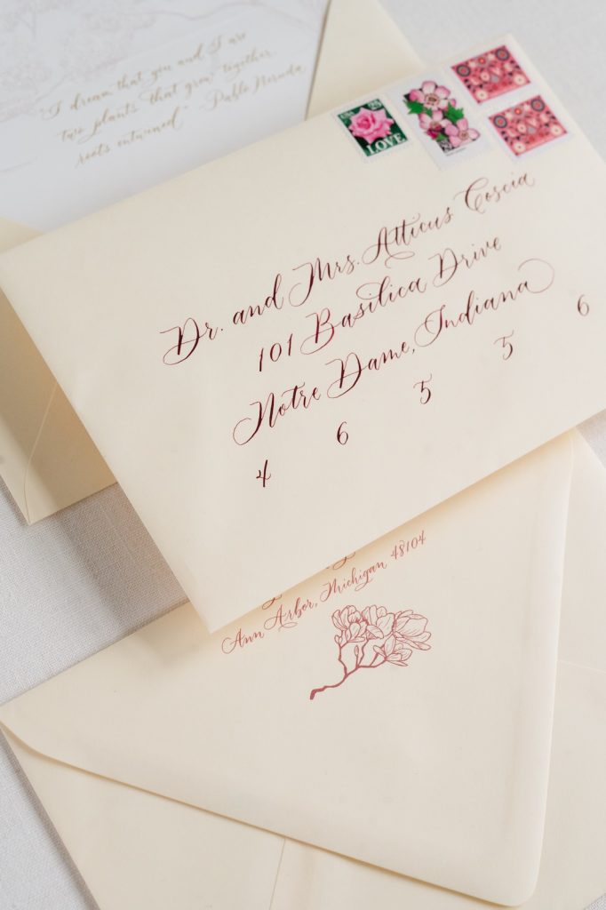The envelope liner featured a hand-drawn illustration of two trees, side by side. Along with the trees, a Pablo Neruda verse was tucked in too. This line was special to Katie and Atticus’s relationship and it felt significant to include it as part of their wedding invitations.