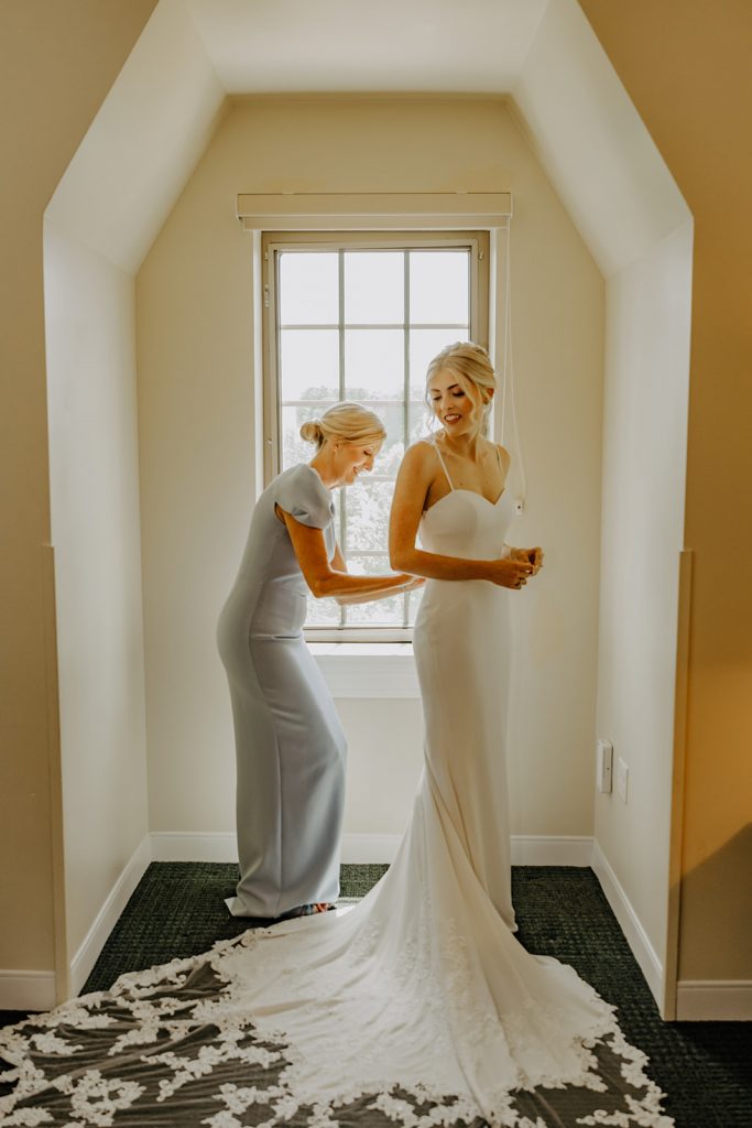Katie was a timeless beauty, with a classic gown. Simple silhouette and gorgeous lace. Hair pulled back in a classic chignon, with just the right amount of “undone” to feel approachable — and like herself. But that cathedral veil brought the drama, perfect for their cathedral ceremony.