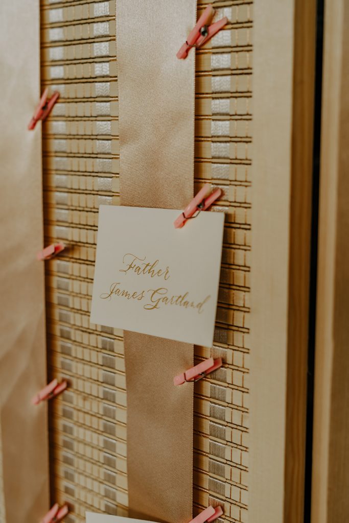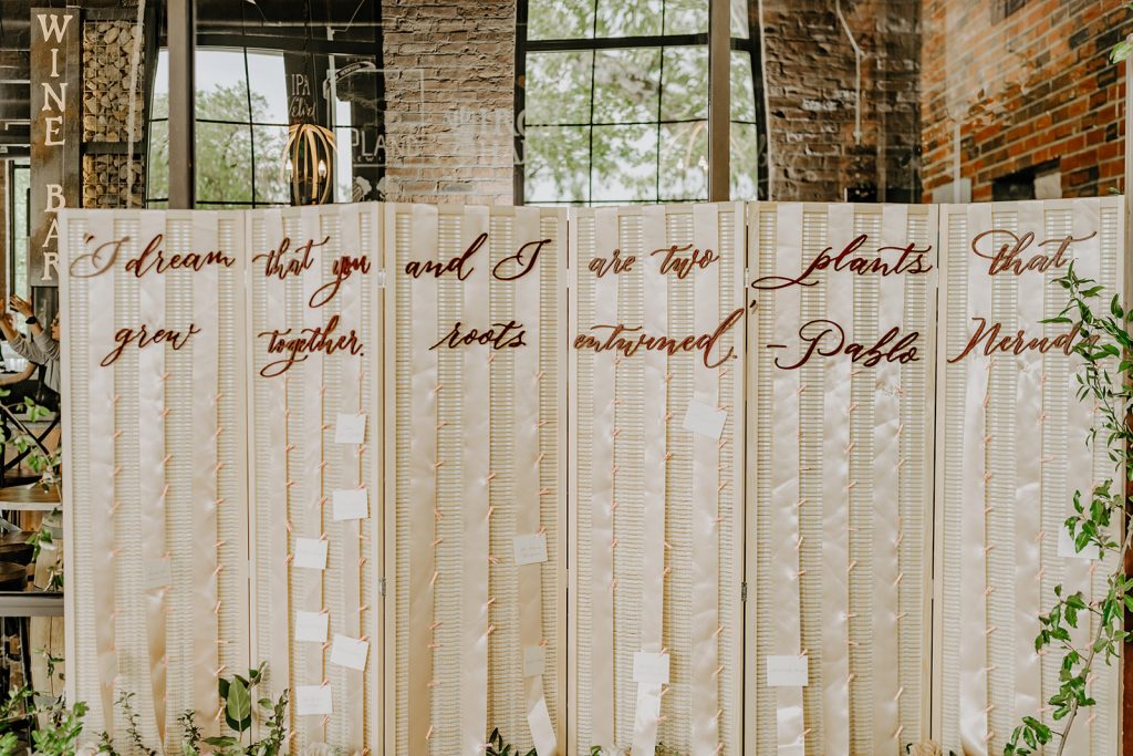 My favorite detail? The same Pablo Neruda quote from their invitation became the top portion of a full wall installation for escort cards! The words were individually laser cut and mounted as the heading for the display. Each escort card was a mini envelope, hand calligraphed in gold ink. What a statement for their loved ones as they entered.